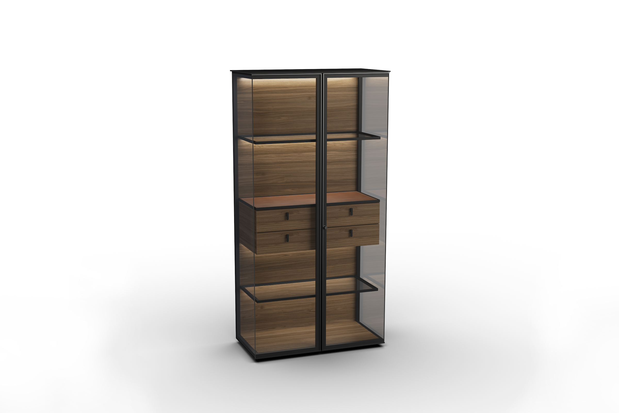 MATEO - это элегантные витрины из стекла и алюминия, создающие уникальную атмосферу современной роскоши в интерьере. Помимо функциональности они сочетают в себе строгость линий, совершенство форм и надежность элементов. Напольная витрина MATEO оснащена высококачественной европейской фурнитурой, а также имеет комфортную подсветку. Витрины в комплектации с ящиками для хранения и органайзером для аксессуаров соединяют в себе комфорт использования и великолепие материалов: ценные породы древесины и отделку из кожи.
