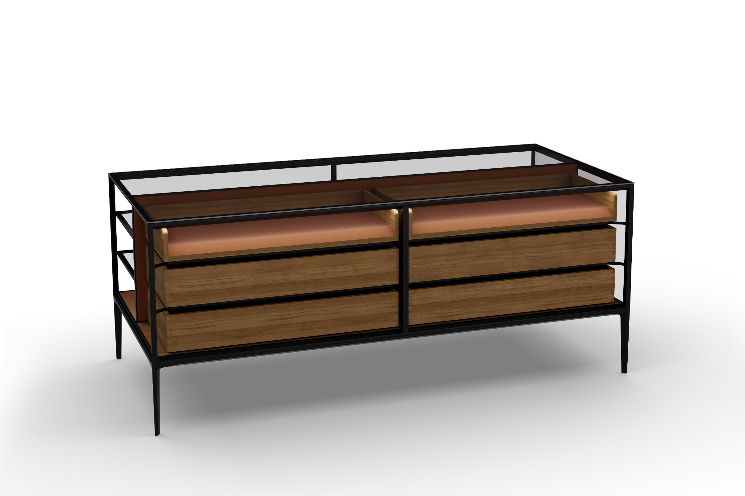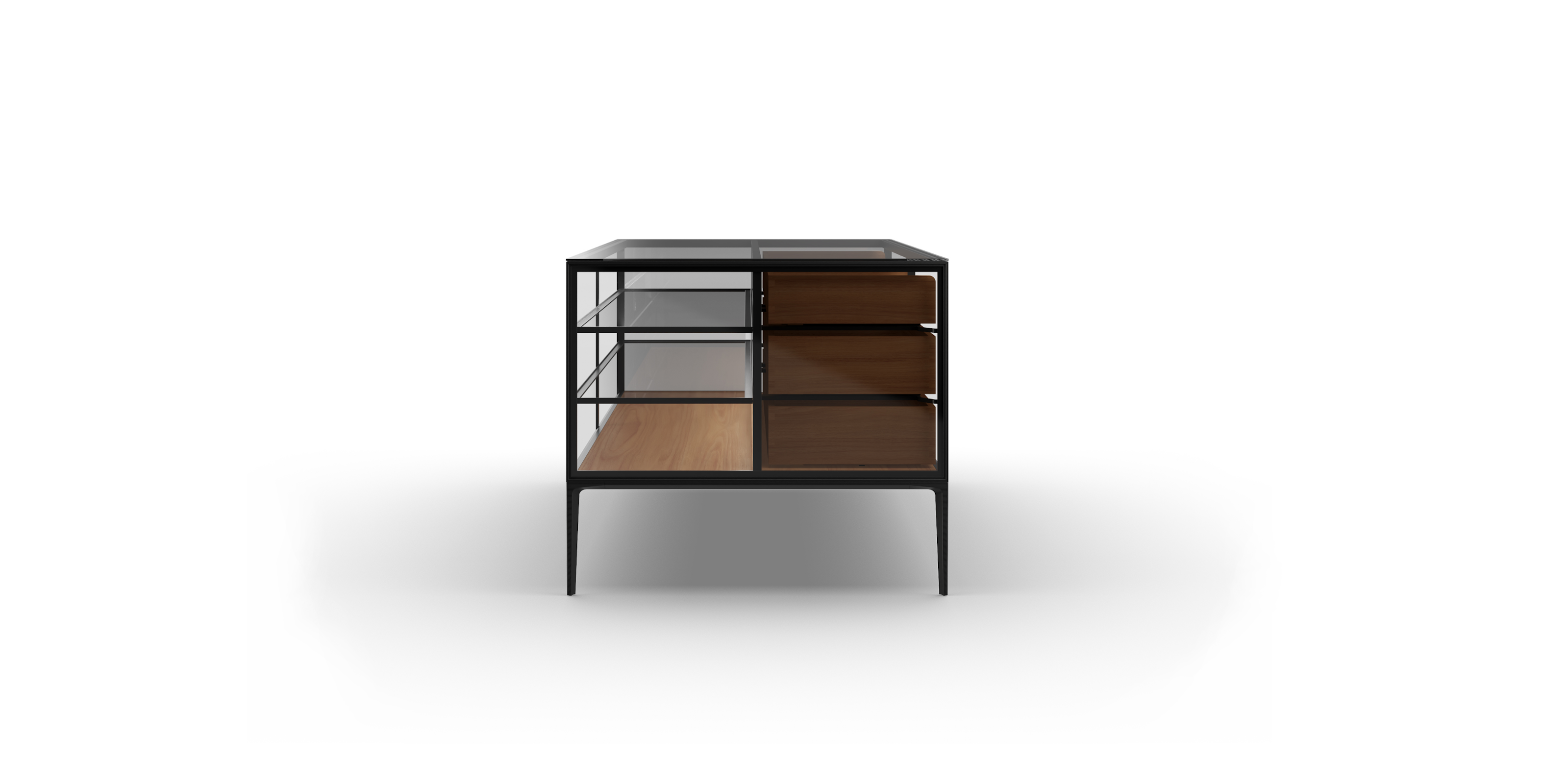 MOSAICO подойдет для тех, кто ценит минимализм, элегантность и безупречное исполнение в каждой детали. Откройте для себя новый уровень роскоши и комфорта. Идеальная геометрия алюминиевого конструктива, несколько вариантов стекла и отделка ящиков кожей. Кроме того, хранение с двух сторон – это очень удобно и практично — все, что нужно будет всегда под рукой. Позвольте MOSAICO стать центром притяжения в вашем пространстве!