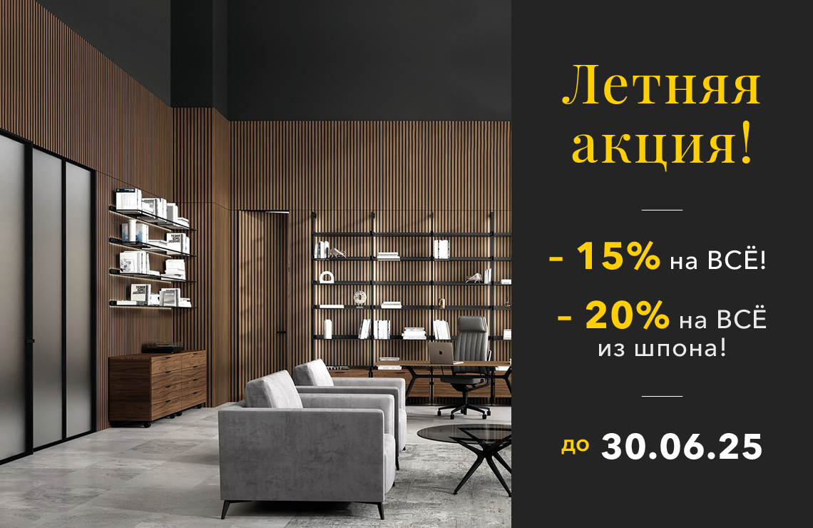Только до 30 июня 2025 вы сможете заказать любые двери, перегородки, стеновые панели и мебель UNION со скидкой 15%, а если они в отделке из шпона, то скидка вырастает до 20%!
