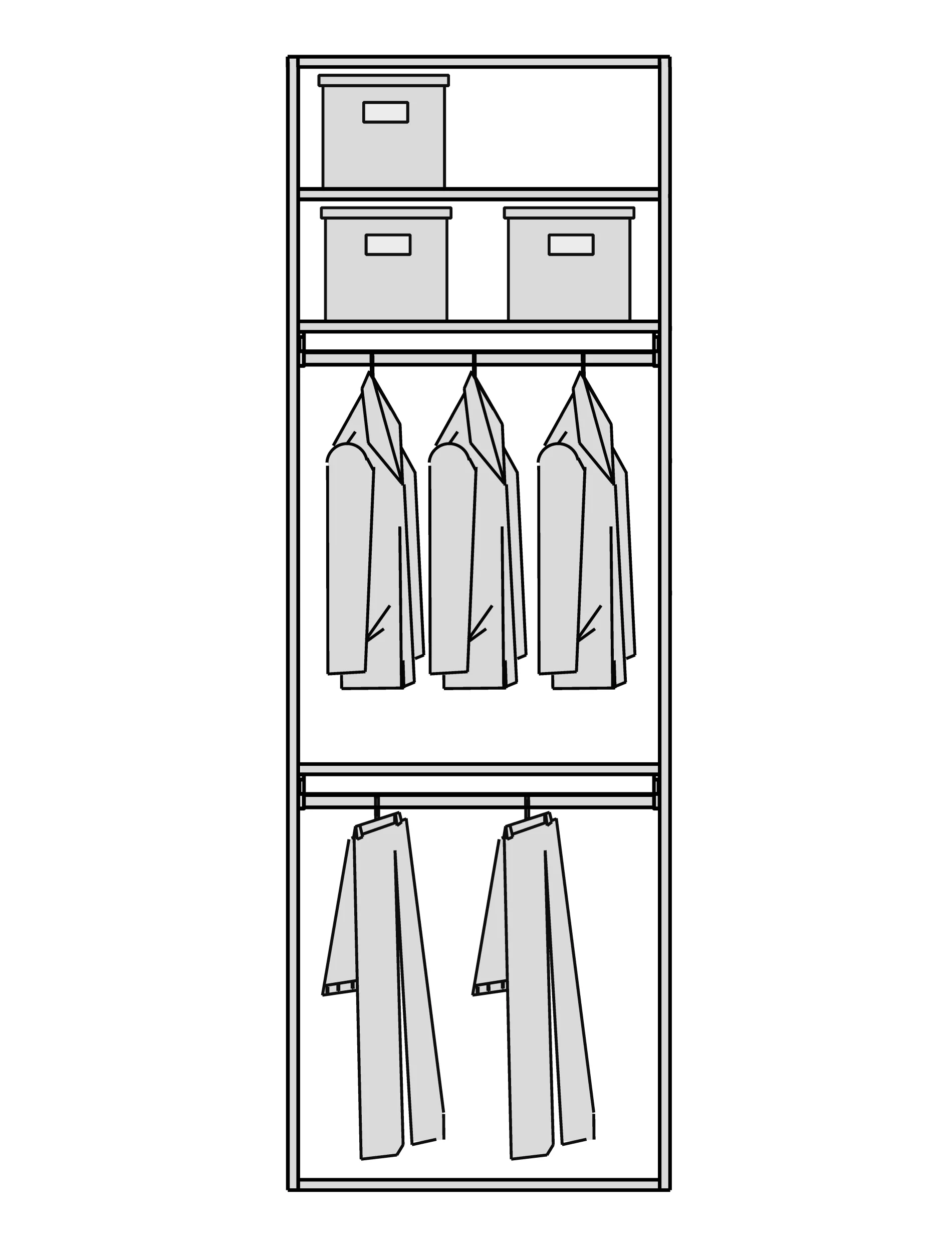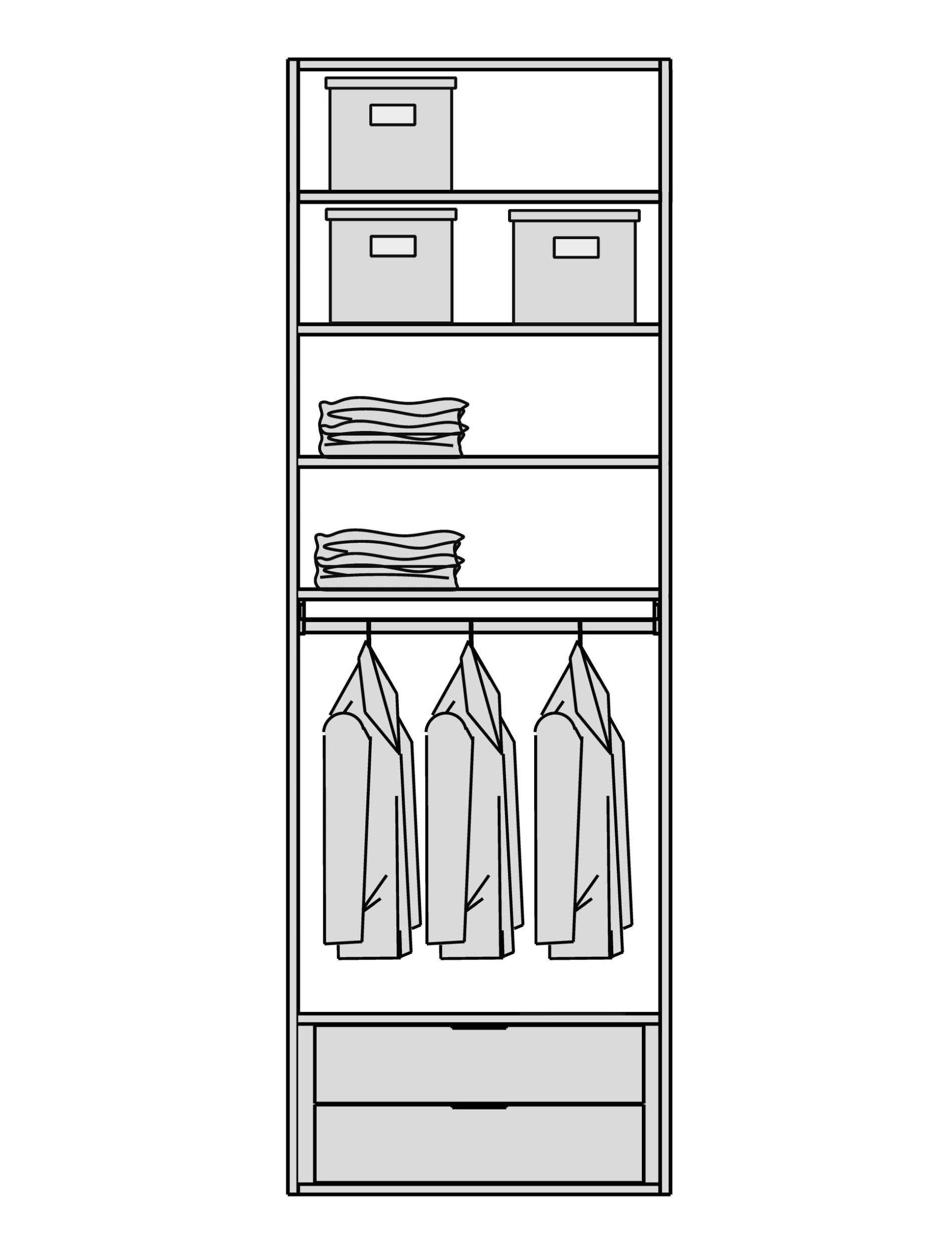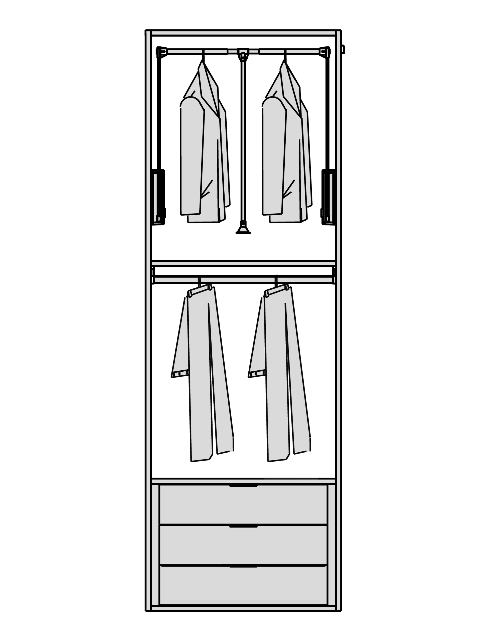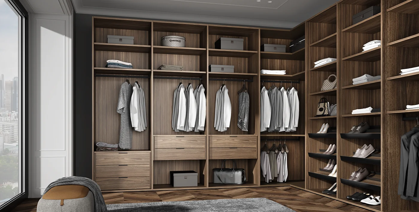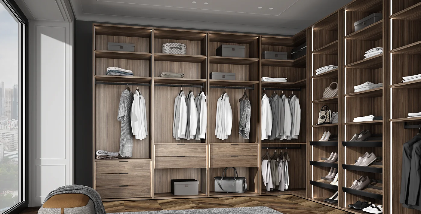 Мы снимаем ограничения с ваших идей. Гардеробная подстраивается под высоту вашего помещения при полезной глубине 56 см. Возможно спроектировать любую конфигурацию: от строгой прямой до монументальной П-образной формы, с установкой в нишу или к стене. - Итальянский дизайн и безупречная точность
