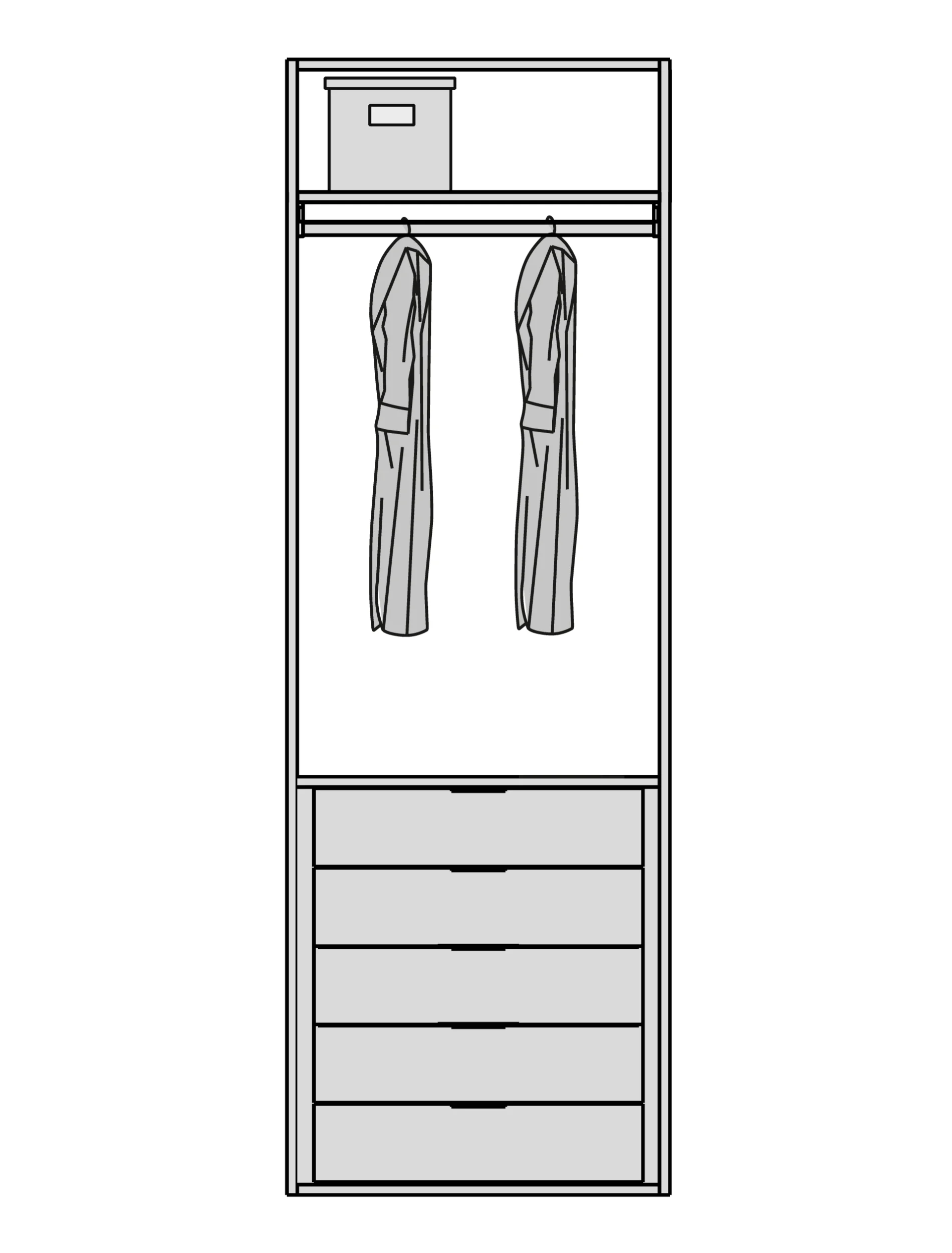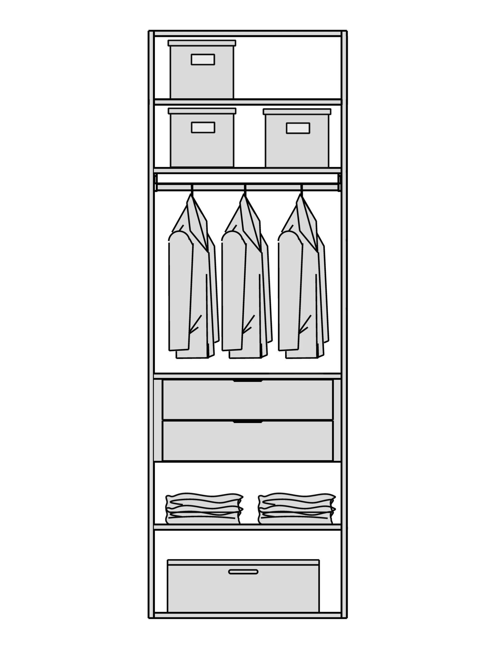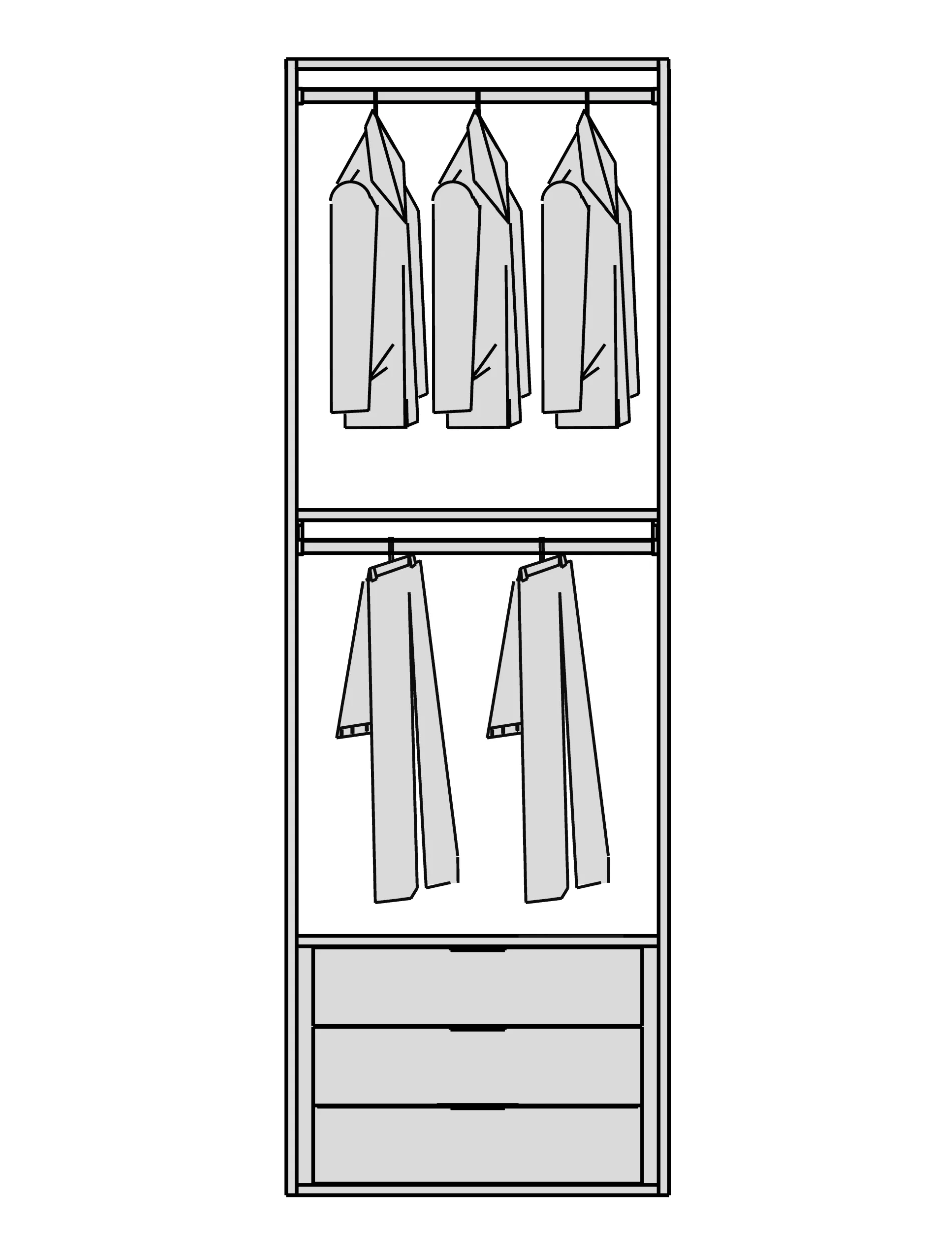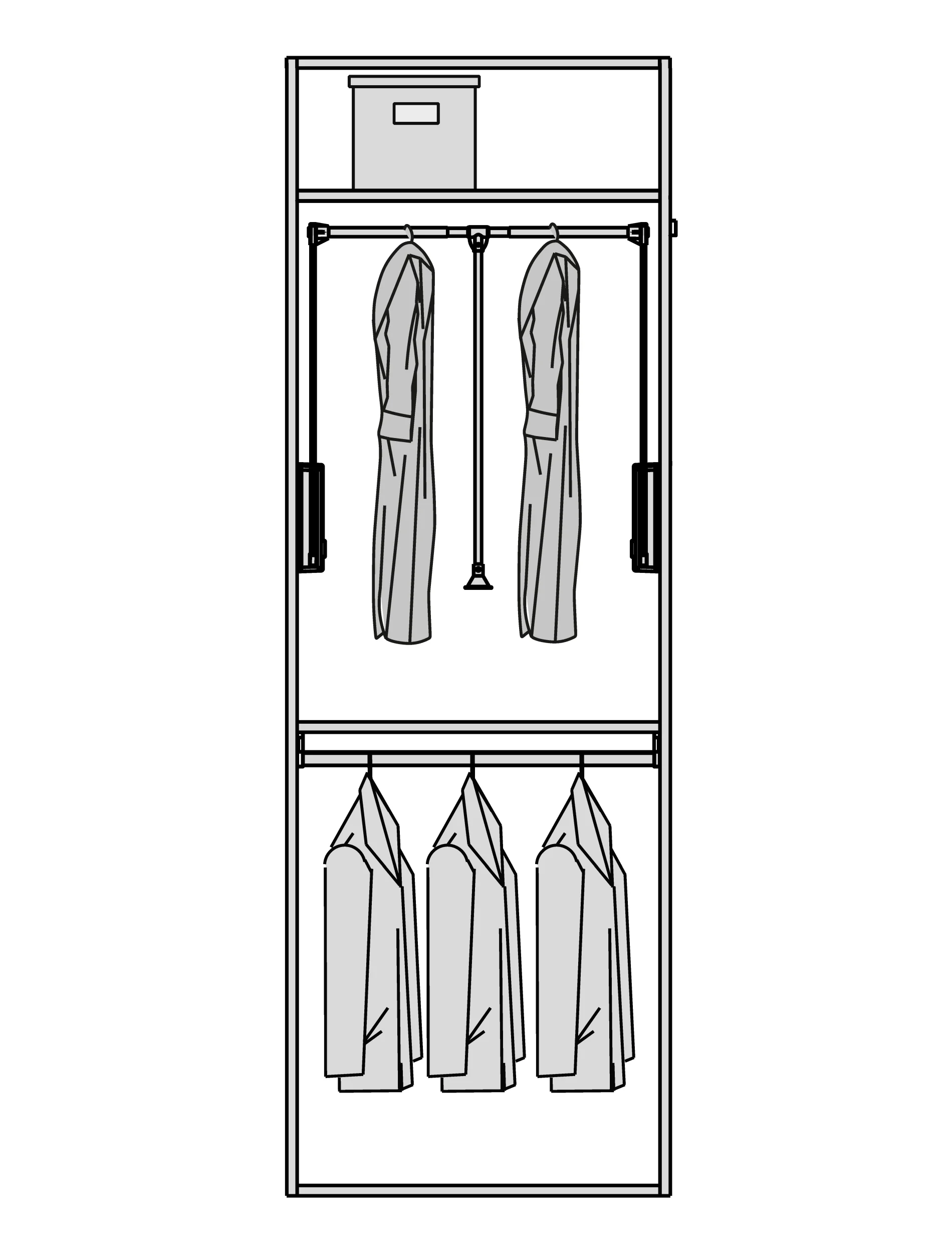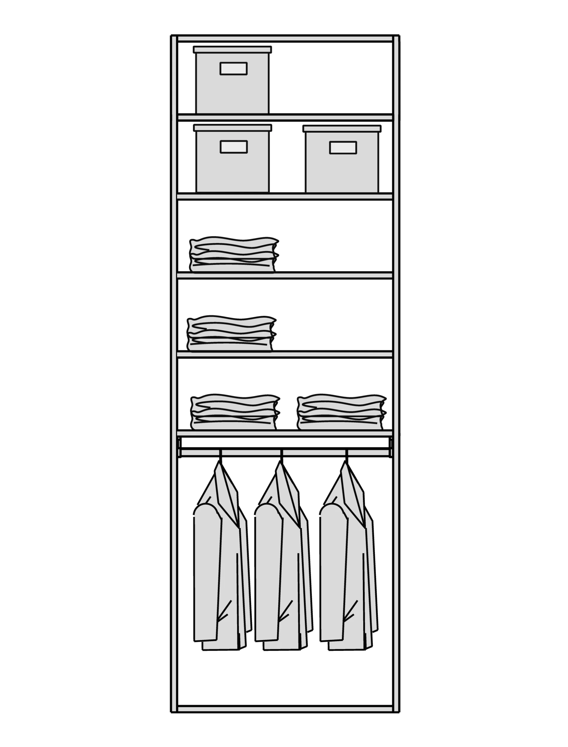 Мы снимаем ограничения с ваших идей. Гардеробная подстраивается под высоту вашего помещения при полезной глубине 56 см. Возможно спроектировать любую конфигурацию: от строгой прямой до монументальной П-образной формы, с установкой в нишу или к стене. - Итальянский дизайн и безупречная точность