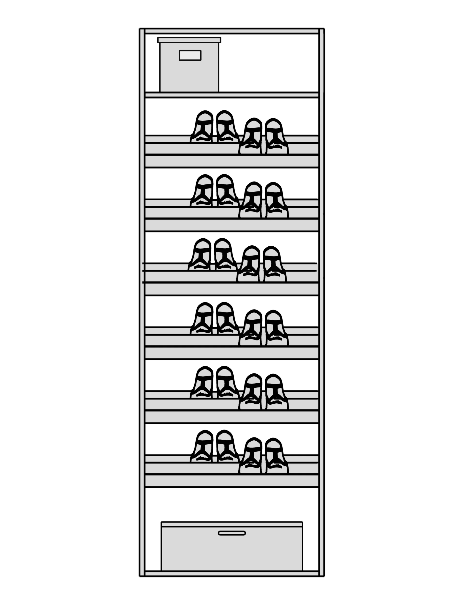 Обувницы с углом наклона 30° для обзора всей коллекции (размещение в 2 ряда).