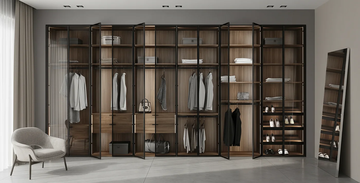 - Угловые элементы гардеробной полного открывания (распахиваются обе створки).