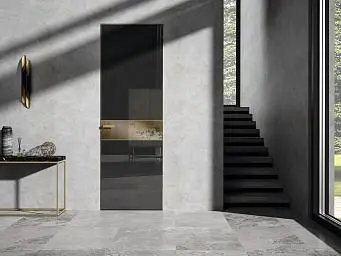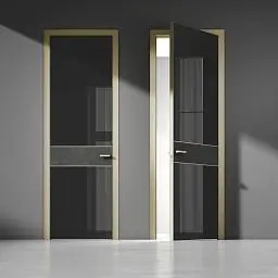 LAGO-60, модель Plain, крашеное глянцевое стекло, цвет G10 Nero, центральная декоративная вставка. Алюминиевый короб-моноблок PLANAR с наличниками, алюминиевый каркас полотна и ручка в отделке AL03 Soft Gold.