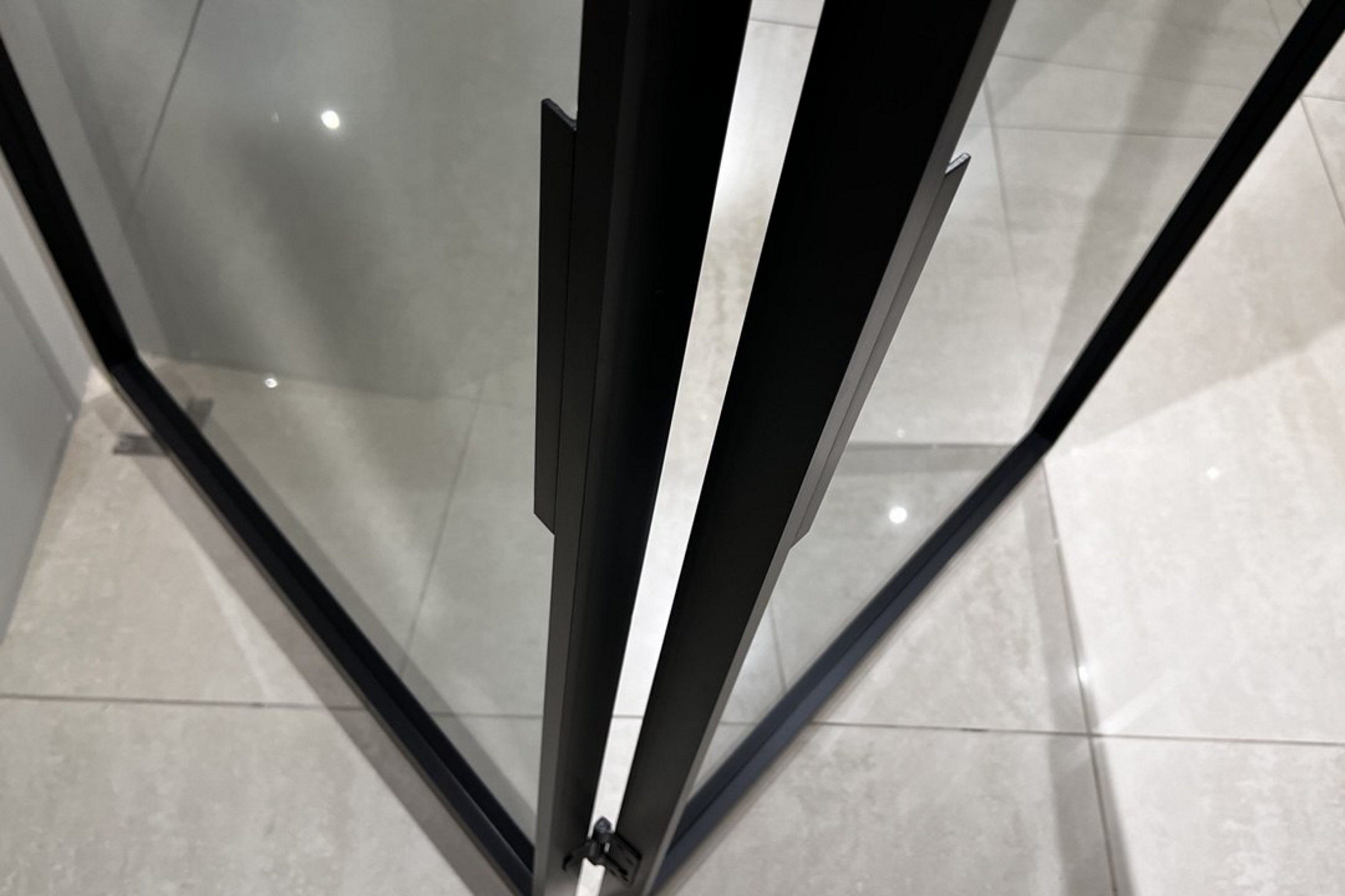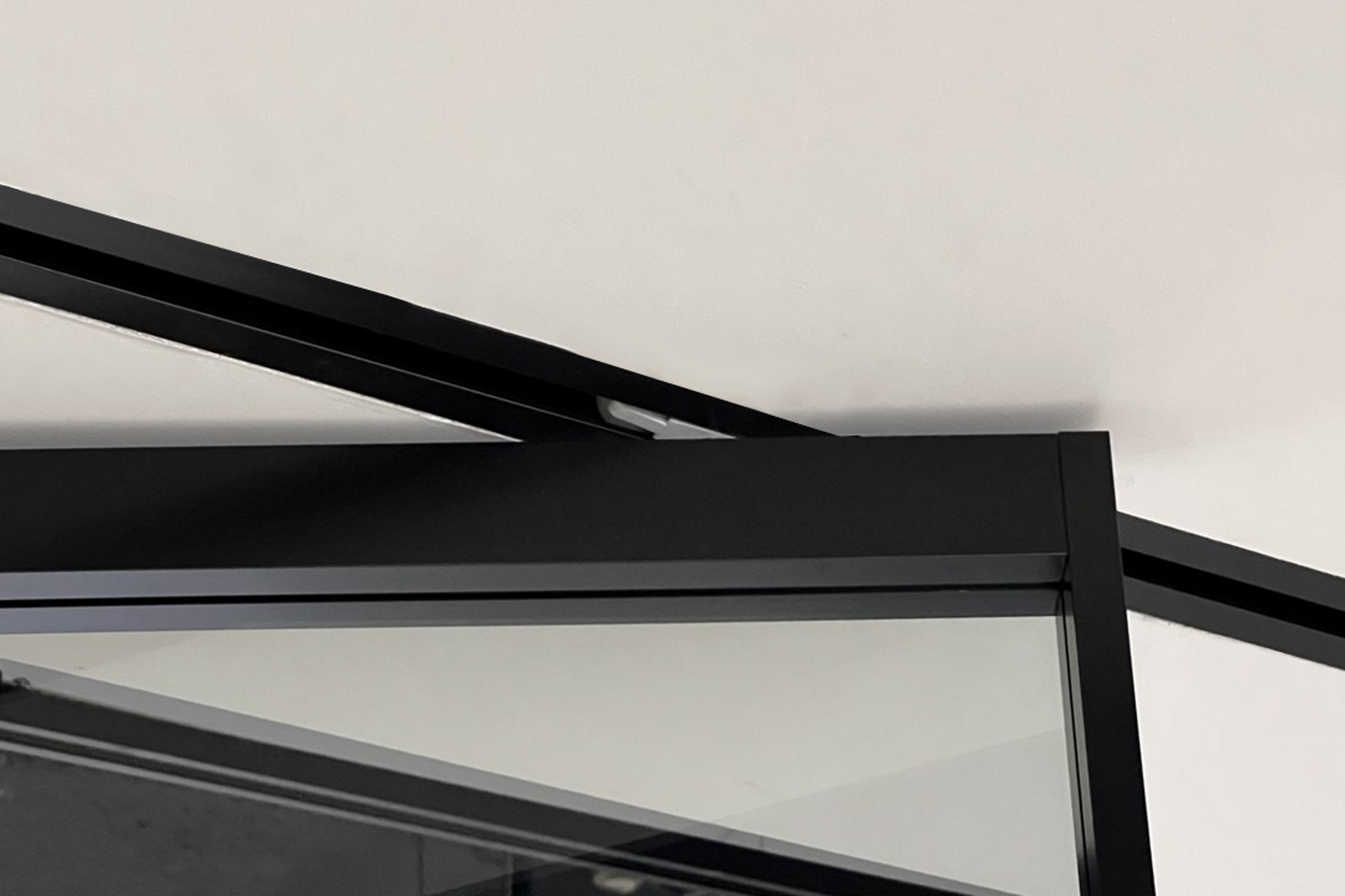 Цена за комплект: полотна с прозрачным безопасным стеклом GT01 Trasparente, модель Space, размер проёма 85x210 см, алюминиевый каркас полотна и алюминиевый "скрытый" трек в отделке - анодировка AL09 Chrome Matt, крепление в потолок, петли, ручки.