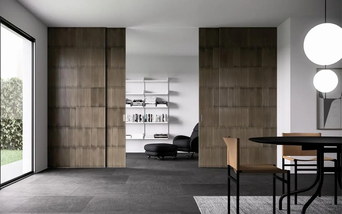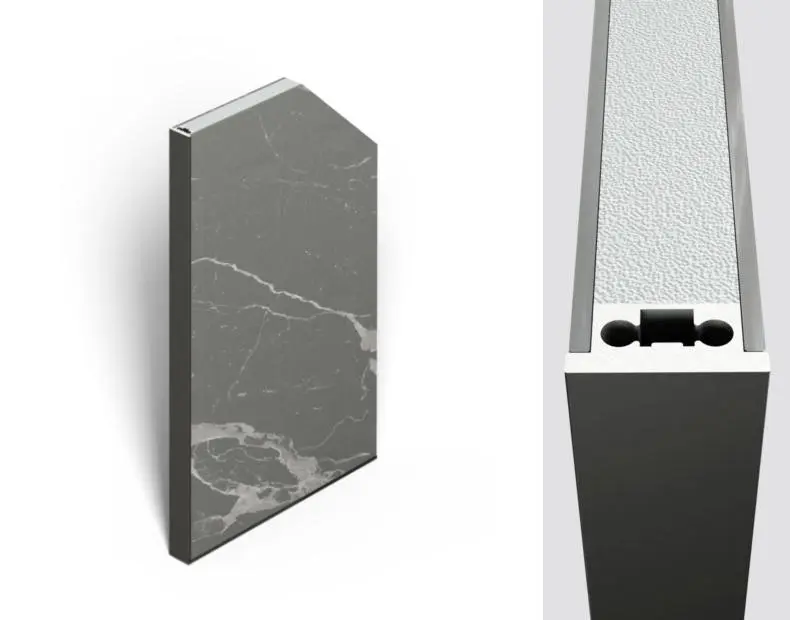 Коллекция Materica включает двери, в которых алюминиевый профиль заключен между двумя панелями из различных материалов: от окрашенного изнутри стекла до камня, от металлической пластины до керамогранита и керамики. В результате получается дверь, которая при монтаже в проём материальной стены, становится неотъемлемой частью архитектуры, реальной частью стены.