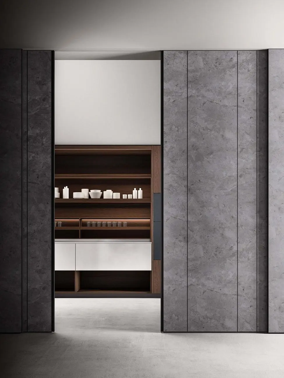 Динамизм и гармония - ключевые слова, характеризующие проект Mimetica, систему раздвижных дверей, которая «маскируется» под стеновые панели, гладкость и минимализм поверхностей нарушается лишь ритмичной гравировкой, позволяющей создавать различные материальные эффекты. Алюминиевый профиль с пазом, в торце полотна на все его высоту, выполняет роль ручки. В полотнах этой коллекции можно использовать множество материалов, включая панели из натурального камня, рафинированные керамические плиты, которые в своих изделиях используют другие бренды, входящие в группу Boffi | DePadova.