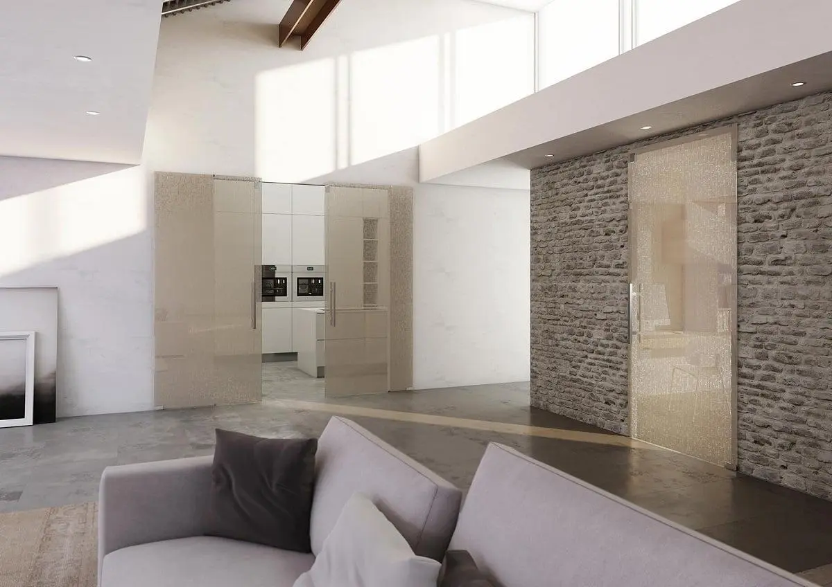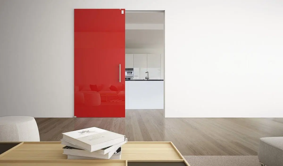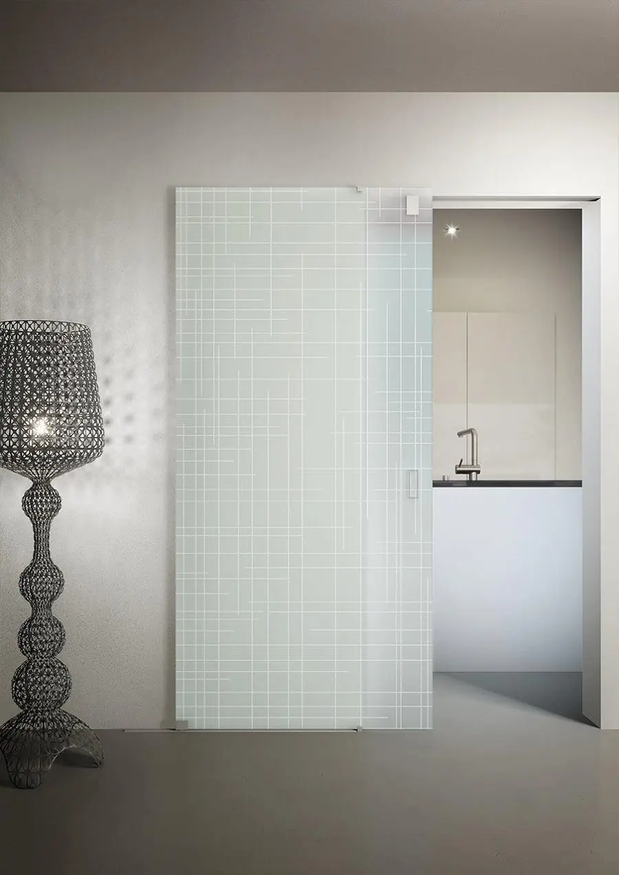 Стеклянное полотно без обрамления. Невидимый крепеж полотна к рельсу. Скрытый рельс монтируется в толщину стены. Нижний ролик на полотне + прозрачная напольная направляющая вдоль стены. Прозрачное, белое, цветное стекло или зеркало. Большой выбор декоров с различной технологией нанесения. Оставить заявку