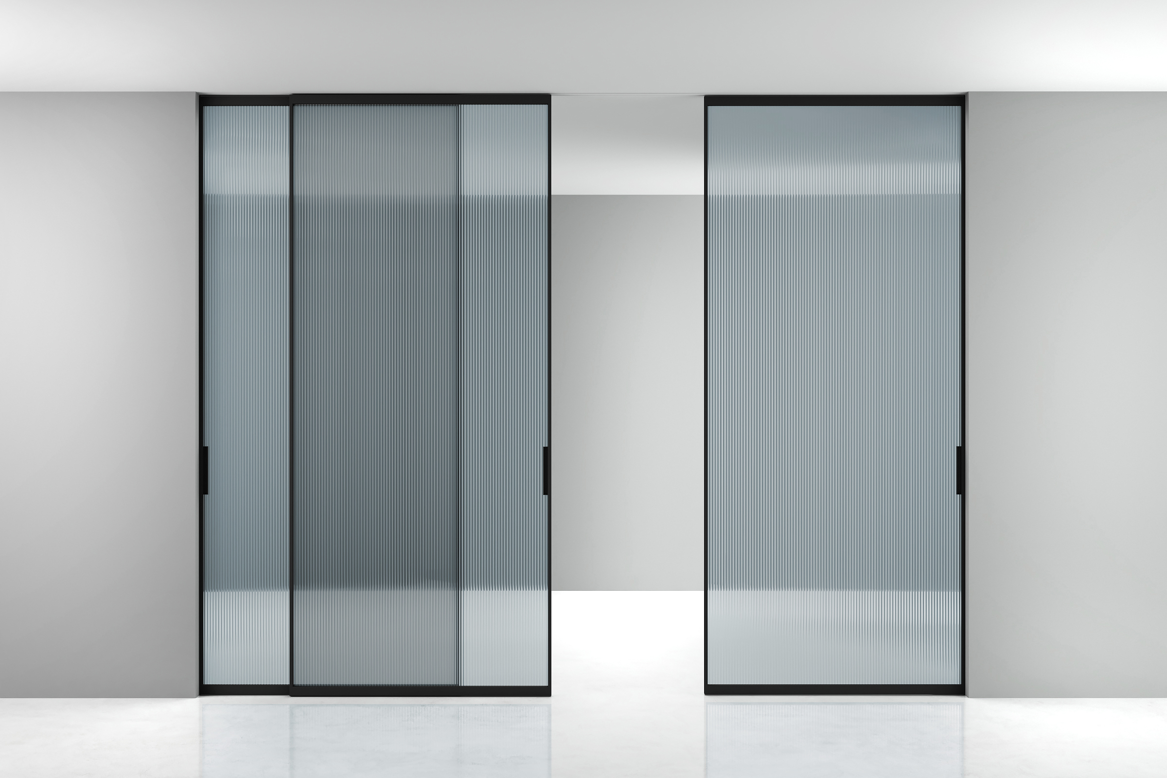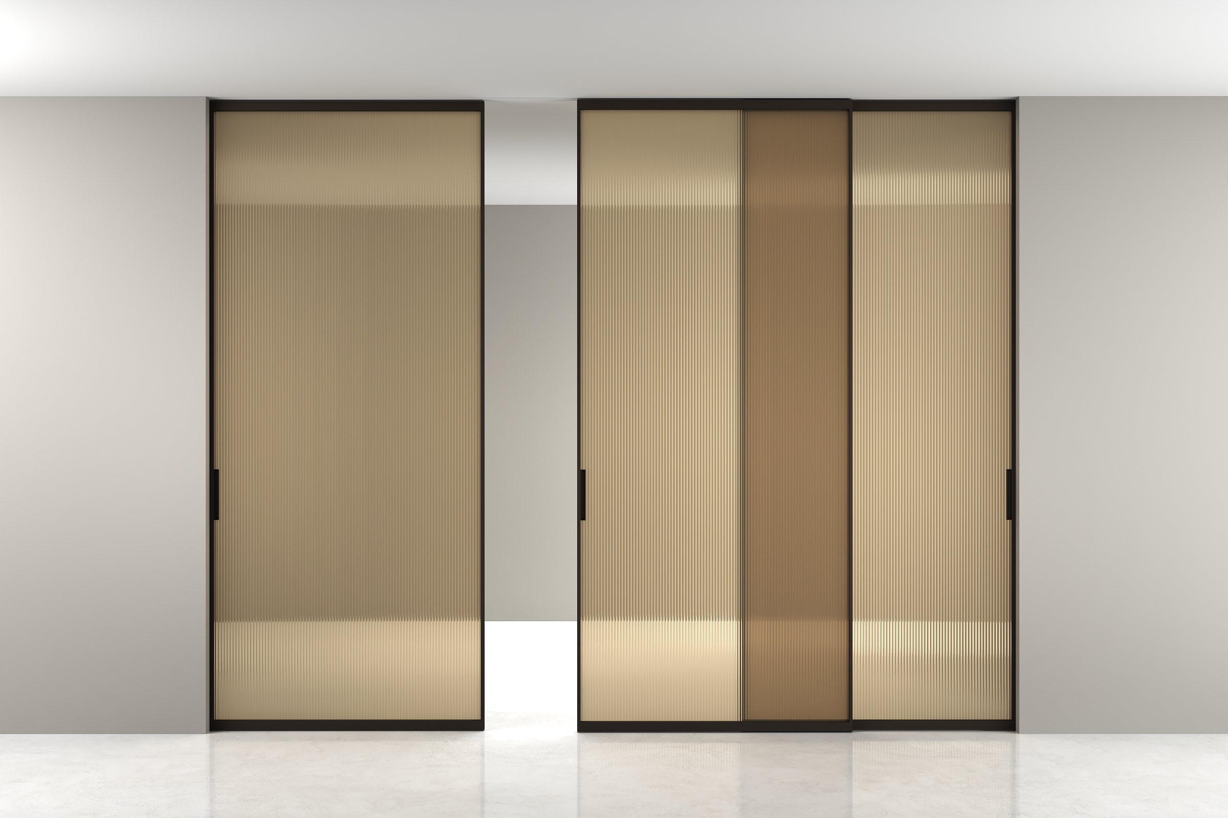 Полотна SLIM изготавливаются из закаленного алюминия и стекла на выбор: прозрачное, матовое, рифленое или зеркало.