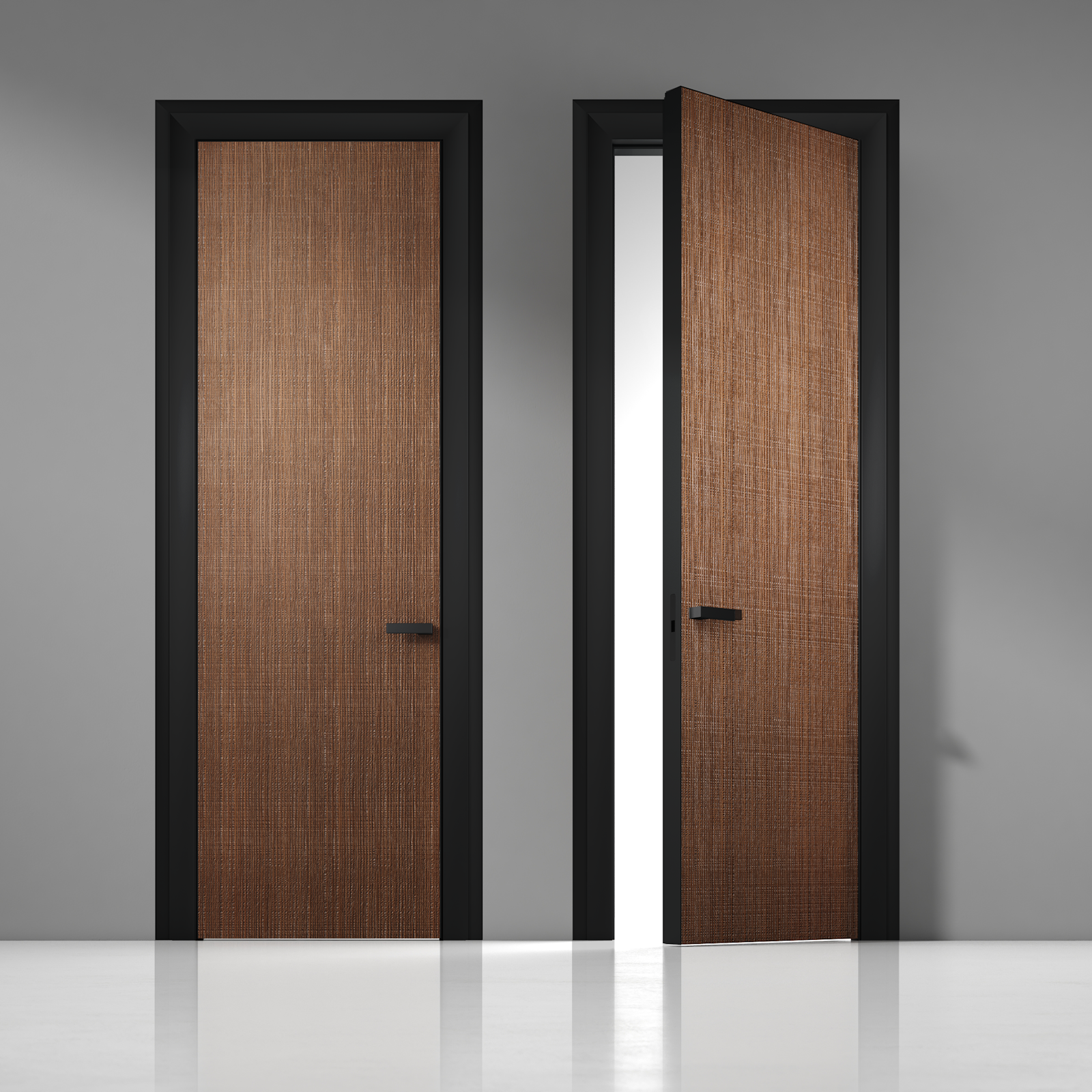 Цена за комплект: полотно толщиной 6 см, модель Canvas, рельефный, структурный 3D рисунок на натуральном шпоне UC40 Noce Italian, условный размер 60/70/80/90x210 см, алюминиевый короб-моноблок DECO с фигурными наличниками в отделке - анодировка AL09 Chrome Matt (наличники со стороны открывания), уплотнитель, скрытые петли, магнитный замок.