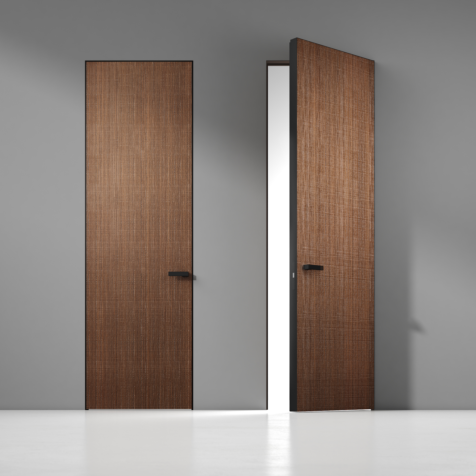 UNIFLEX-3D, Alu, Canvas / INVISIBLE.Цена за комплект: полотно толщиной 60 мм, модель Canvas, рельефный, структурный 3D рисунок на натуральном шпоне UC40 Noce Italiano, условный размер 60/70/80/90x200/210 см, алюминиевая торцевая кромка на полотне в отделке - анодировка AL09 Chrome Matt, алюминиевый "скрытый" короб INVISIBLE под покраску, уплотнитель, скрытые петли, магнитный замок.