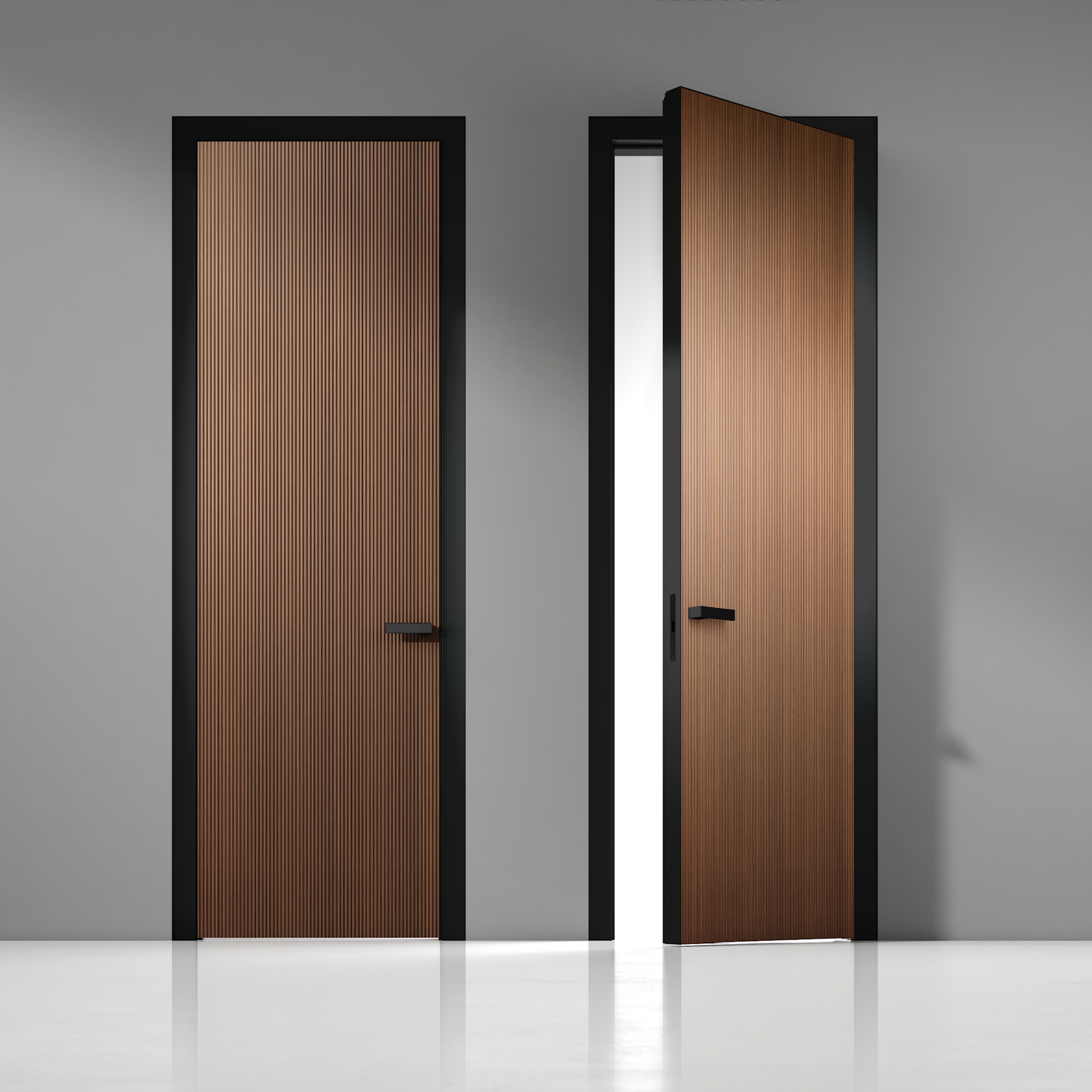 Дверь на алюминиевом коробе с наличниками. Отделка – вертикальная фрезеровка на натуральном шпоне