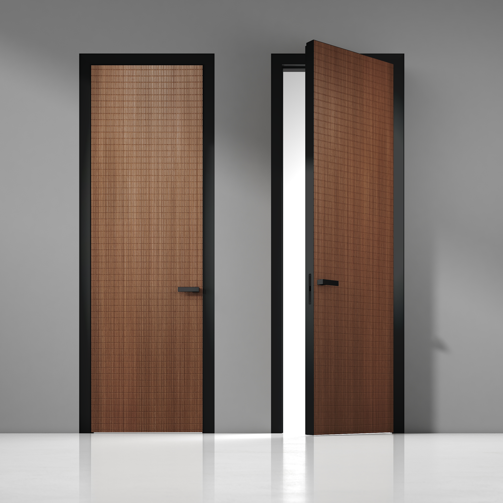 Цена за комплект: полотно толщиной 6 cм, модель Tartan, рельефный, структурный 3D рисунок на натуральном шпоне UT40 Noce Italiano, условный размер 60/70/80/90x210 см, алюминиевый короб-моноблок PLANAR с наличниками в отделке - анодировка AL09 Chrome Matt (наличники со стороны открывания), уплотнитель, скрытые петли, магнитный замок.
