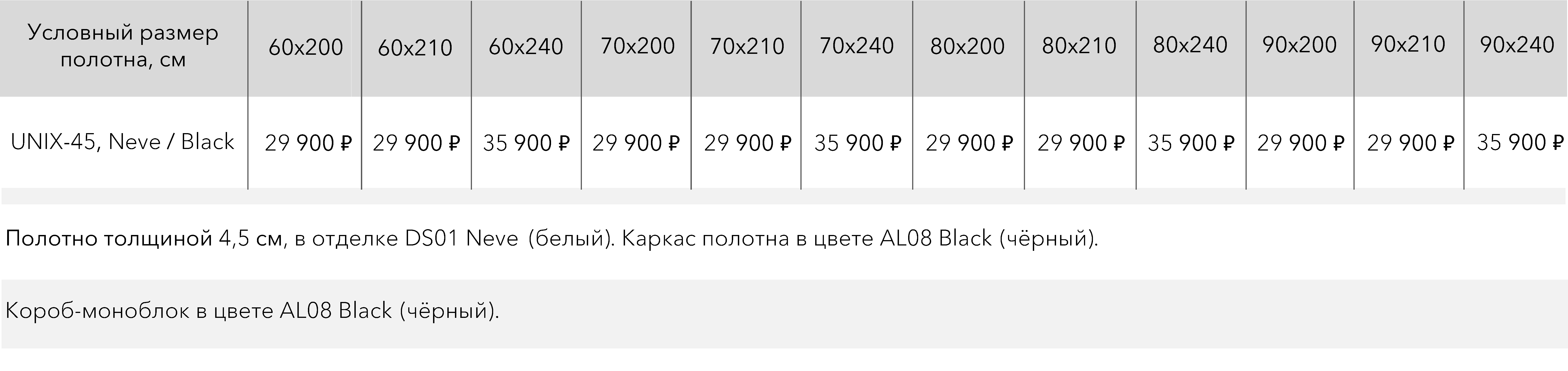 UNIX-45, DRY SKIN.Цена за комплект: полотно в отделке - декоративное покрытие DS01 Neve, условный размер 60/70/80/90x200/210 см, алюминиевый каркас полотна в цвете AL08 Black. Короб: алюминиевый моноблок с наличником со стороны открывания в отделке - AL08 Black. Уплотнитель, видимые петли, замок.