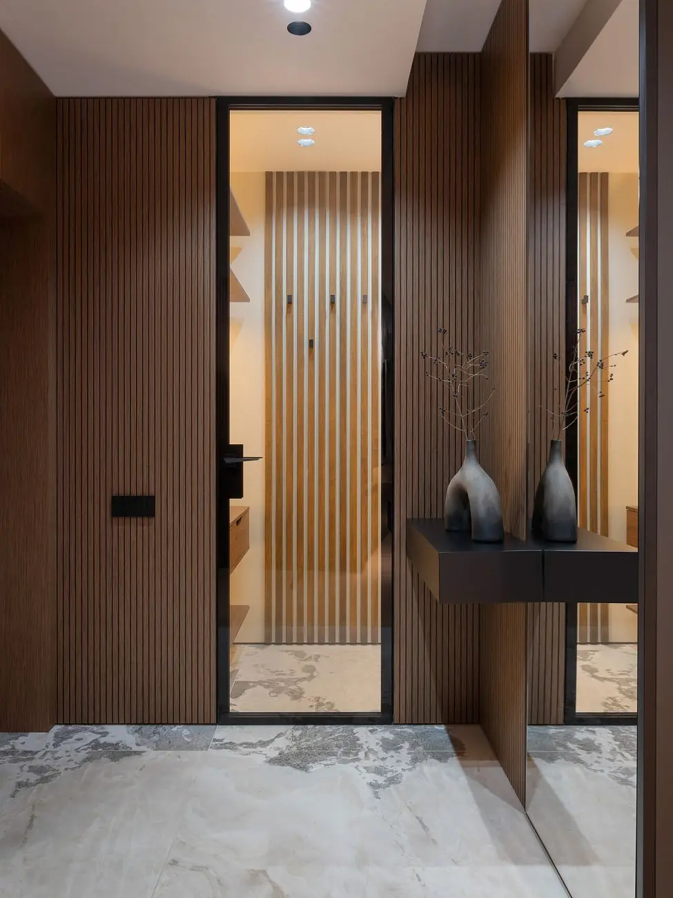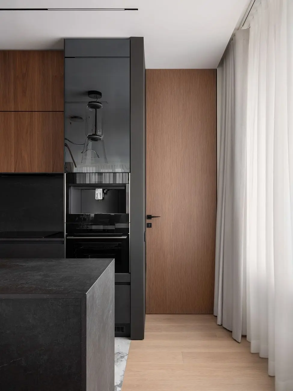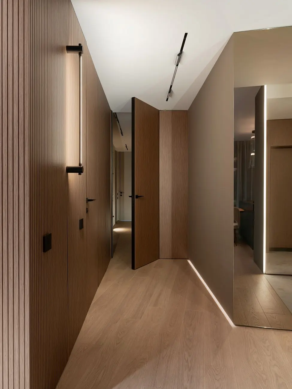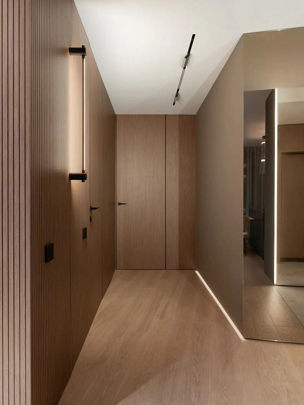 В проекте использованы решения UNION, которые органично дополняют в интерьер и поддерживают его общую логику. Стеновые панели UNIFLEX-3D, Step | ЮНИФЛЕКС-3D, Степ в натуральном шпоне сочетаются с отделкой дверей и усиливают ощущение продуманного пространства.