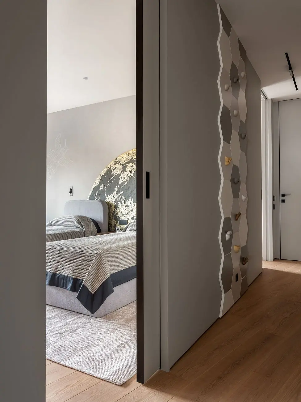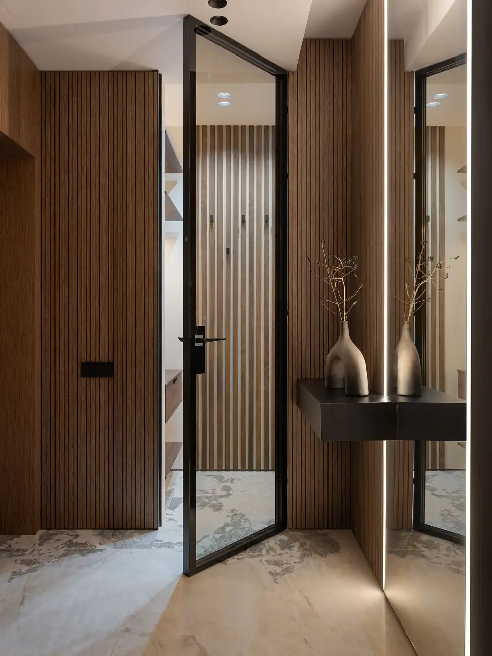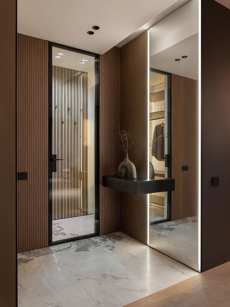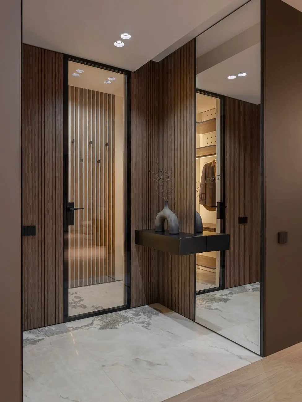 В проекте использованы решения UNION, которые органично дополняют в интерьер и поддерживают его общую логику. Стеновые панели UNIFLEX-3D, Step | ЮНИФЛЕКС-3D, Степ в натуральном шпоне сочетаются с отделкой дверей и усиливают ощущение продуманного пространства.