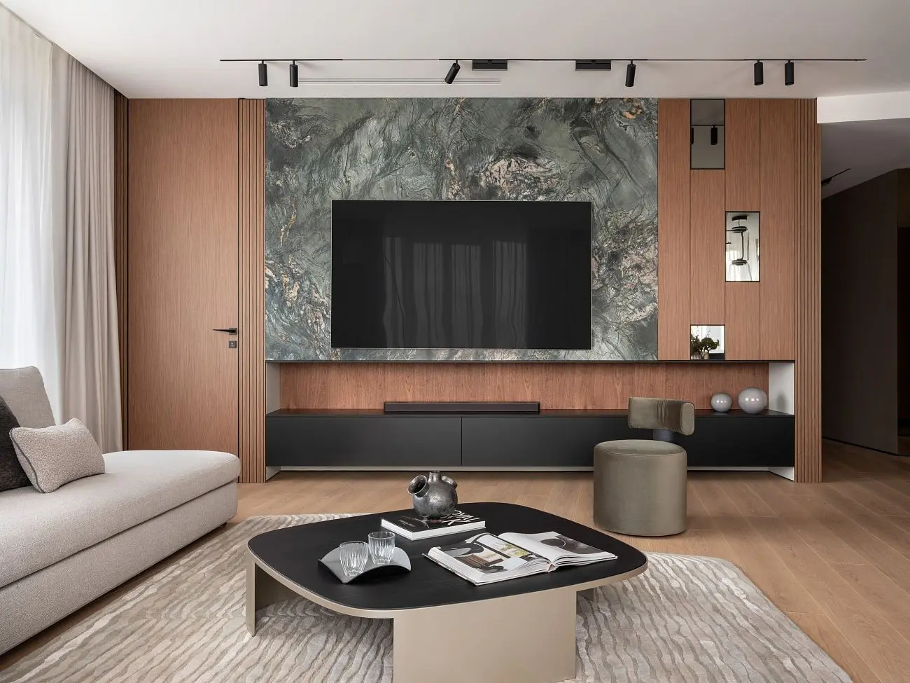 Пространство выстроено так, чтобы каждая зона была удобной в ежедневном использовании и визуально поддерживала общую архитектуру дома. Мраморная стена в гостиной, спокойная палитра, чистые линии и продуманные переходы между помещениями создают атмосферу «тихой роскоши».