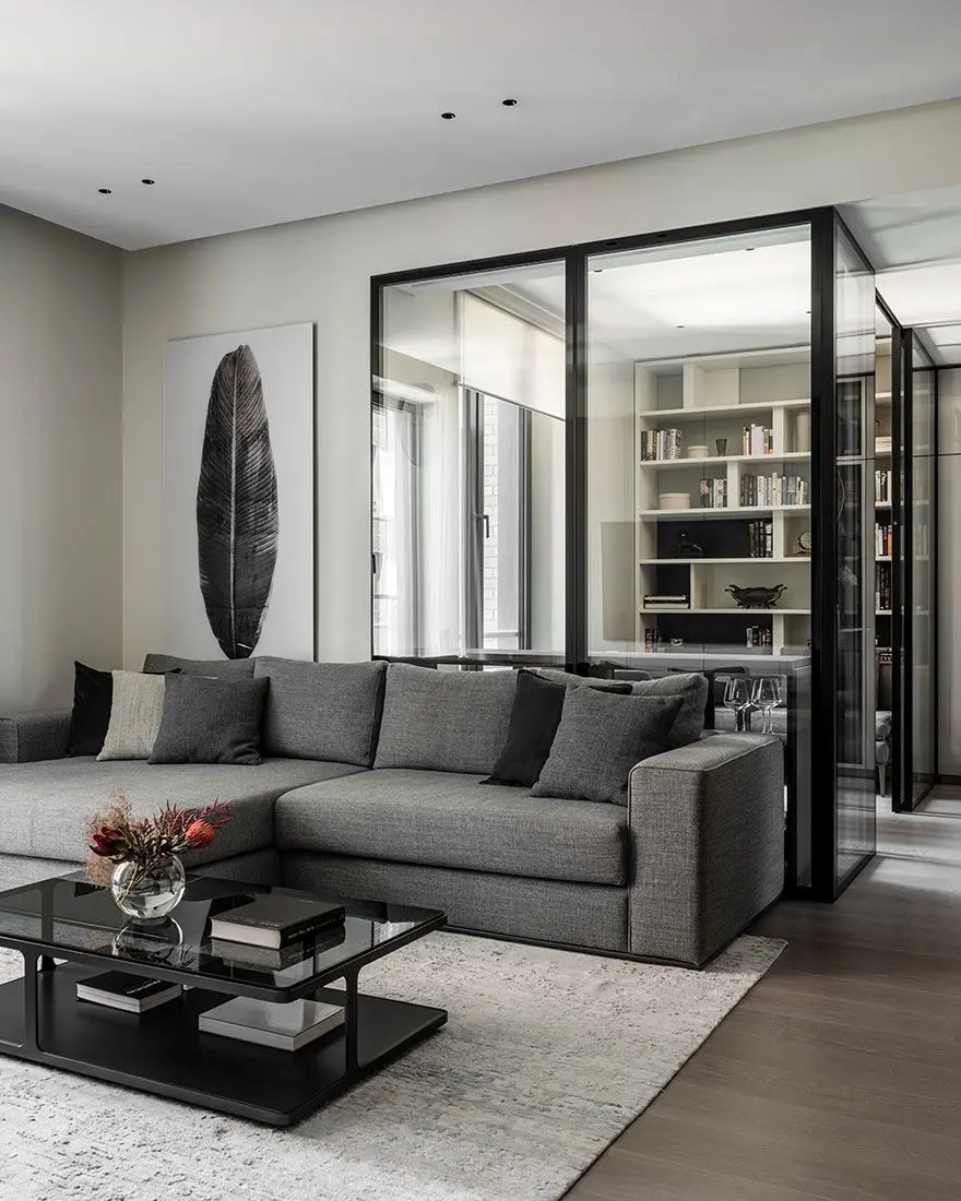 - Так, для зонирования рабочего кабинета и небольшой домашней библиотеки были выбраны перегородки UNION с двойным стеклом. Функциональное помещение с раздвижными и стационарными створками.