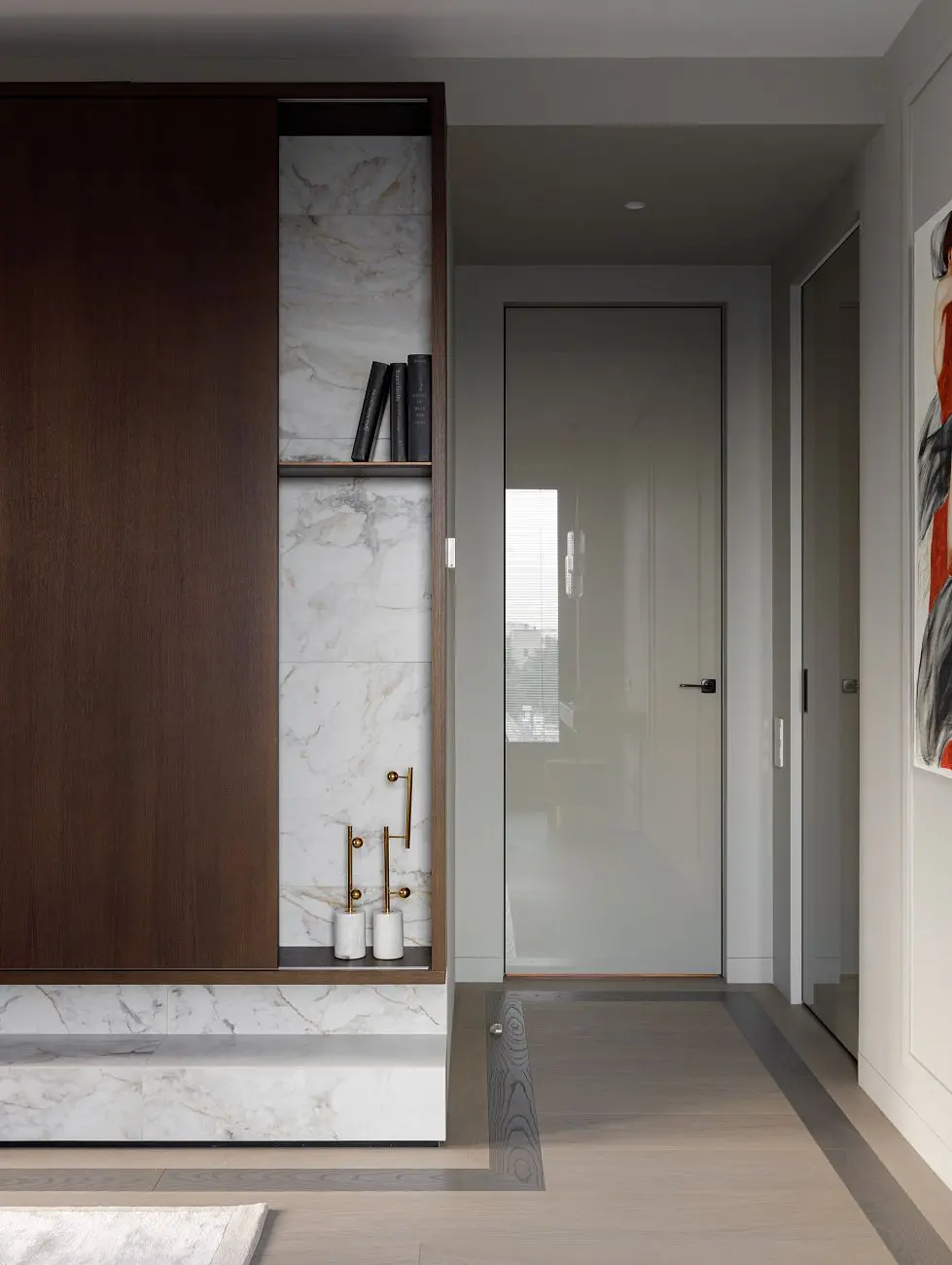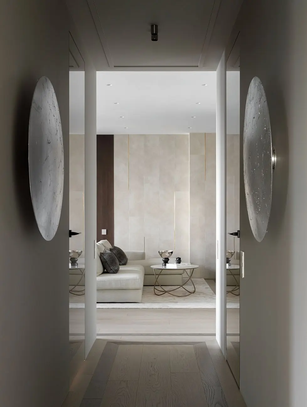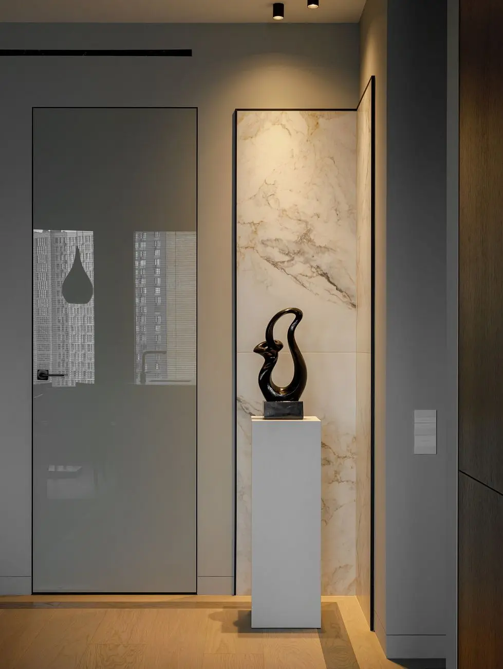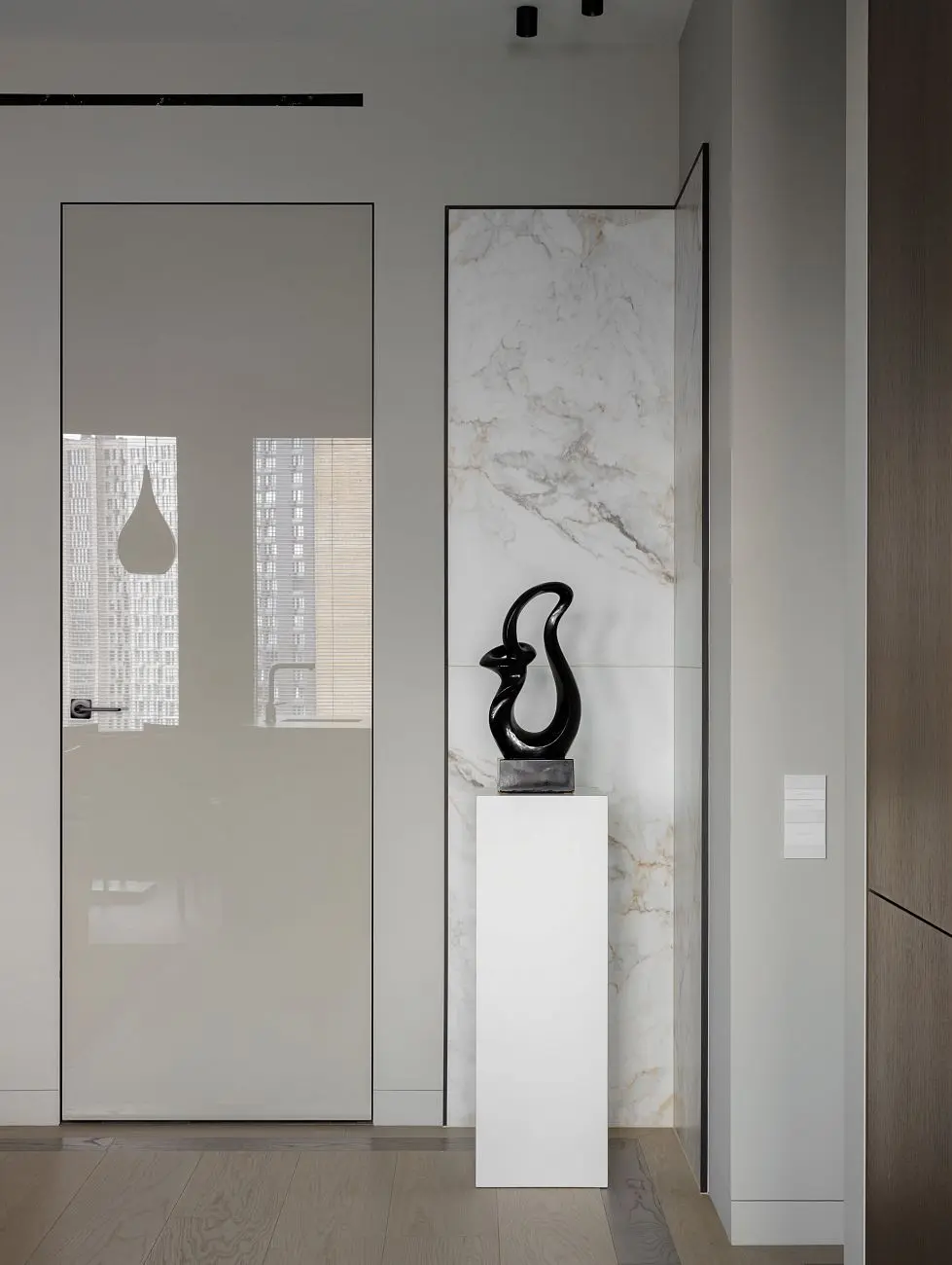 Глянцевая поверхность на полотнах добавляет интерьеру глубины и мягко работает со светом, усиливая ощущение элегантности и визуальной легкости. Скрытый монтаж позволяет сделать переходы между помещениями максимально деликатными и сохранить внимание на общей композиции интерьера, материалах и деталях.